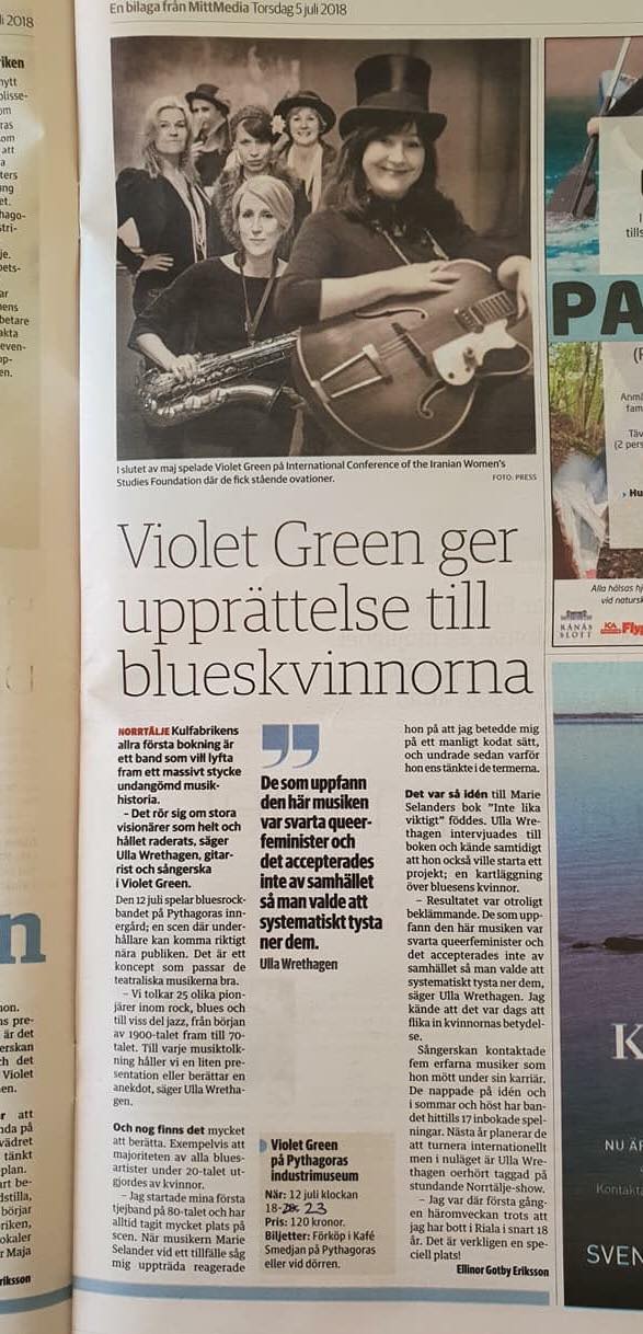 Violet Green are touring around in the Nordic countries, on jazz & blues clubs, churches, schools, pubs and theaters, with a show that opens a treasure chest filled with music and anecdotes about the songs and lives of the most outstanding and inspiring blues divas. Violet Greens show are lifting the tremendous impact women have had during this century; from the 1920´s, until today, artists/musicians like Ma Rainey, Bessie Smith, Victoria Spivey, Ethel Waters, Memphis Minnie, Big Mama Thornton, Big Maybelle, Etta James, Mahalia Jackson, Sister Rosetta Tharpe, Aretha Franklin, Nina Simone, Janis Joplin, Mavis Staples - she´s still touring around the world, despite of her age at 80 year. An inspiring artist and a role model!