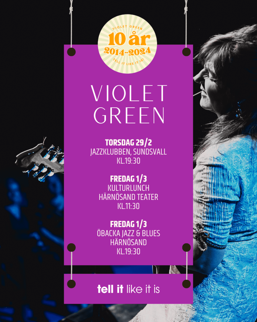 Violet Green are touring around in the Nordic countries, on jazz & blues clubs, churches, schools, pubs and theaters, with a show that opens a treasure chest filled with music and anecdotes about the songs and lives of the most outstanding and inspiring blues divas. Violet Greens show are lifting the tremendous impact women have had during this century; from the 1920´s, until today, artists/musicians like Ma Rainey, Bessie Smith, Victoria Spivey, Ethel Waters, Memphis Minnie, Big Mama Thornton, Big Maybelle, Etta James, Mahalia Jackson, Sister Rosetta Tharpe, Aretha Franklin, Nina Simone, Janis Joplin, Mavis Staples - she´s still touring around the world, despite of her age at 80 year. An inspiring artist and a role model!