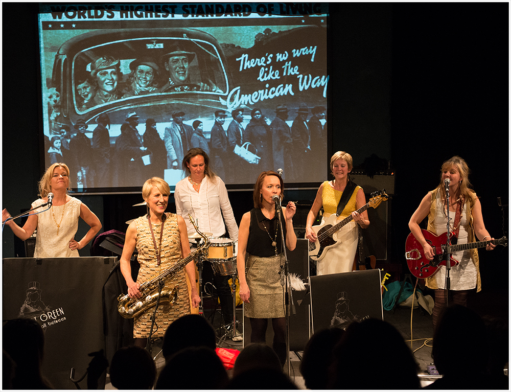 På scenen: Jenny Fall (sång), Ulla Wrethagen (gitarr, sång), Elsie Petrén (sax), Anna Hammarsten (piano, sång), Lena Andersson (bas) och Eva Grund (trummor).